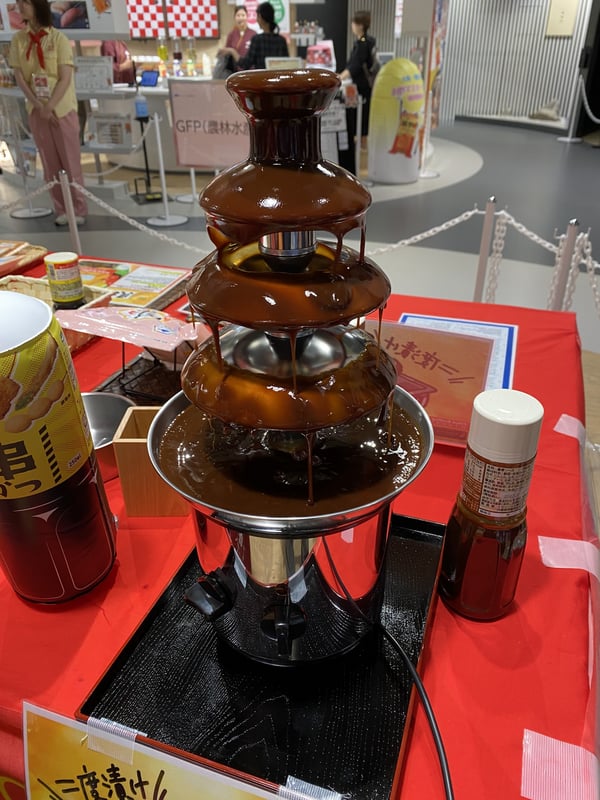 串に刺した「貝柱風味フライ」を大阪の串カツ風にして、チョコレートタワーならぬソースタワーを作り、ソースフォンデュにしました。