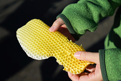 これ本当は、「無駄巣」と言って巣枠の外にできてしまったもので、私たち養蜂家の怠慢というか…管理不足でミツバチたちに無駄に作らせてしまった巣の一部なんですけどね。