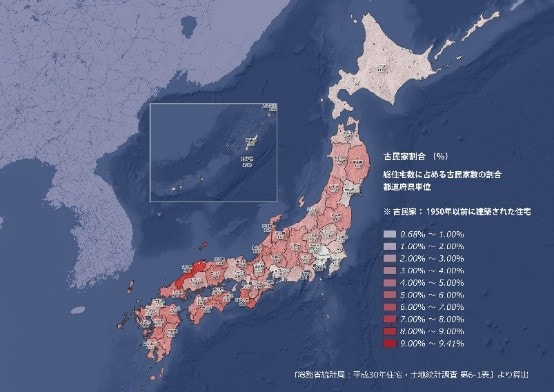 総務省の調査では、昭和35年以前に建築された全ての住宅に対する古民家の割合は島根県が1位で、2位が和歌山県、3位が佐賀県です。