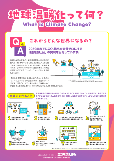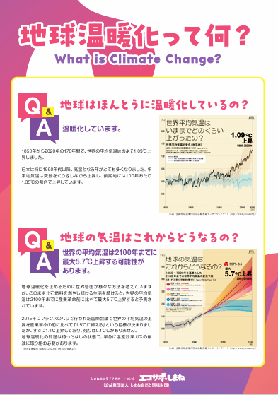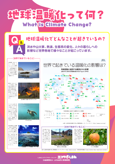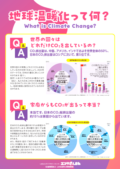 「地球温暖化って何?」「本当に温暖化しているの?」など疑問に答える形式で温暖化の原因や防止策を紹介しています。