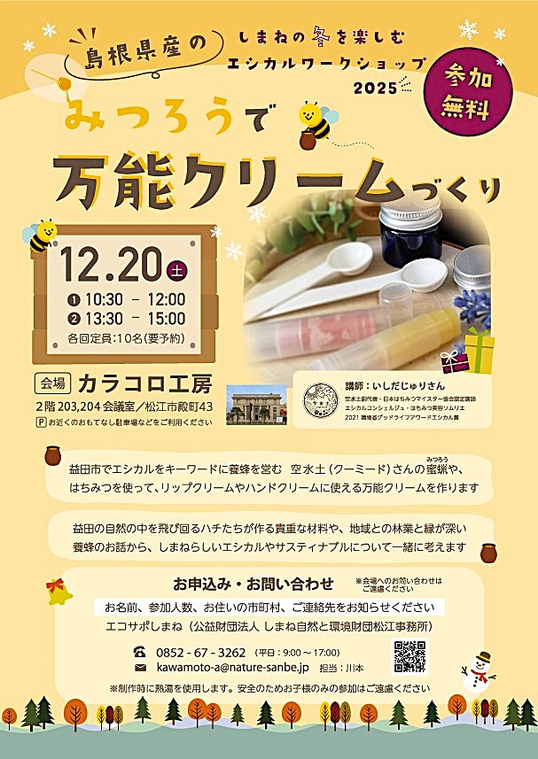 【満員御礼】12/20(土)開催🐝冬のエシカルWS「島根県産のみつろうで万能クリームづくり」