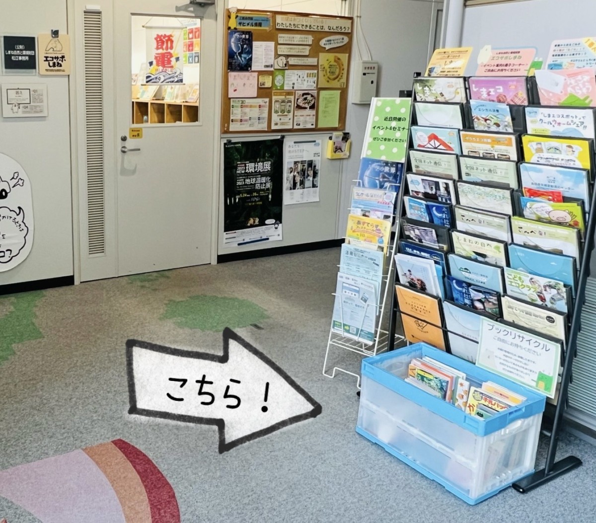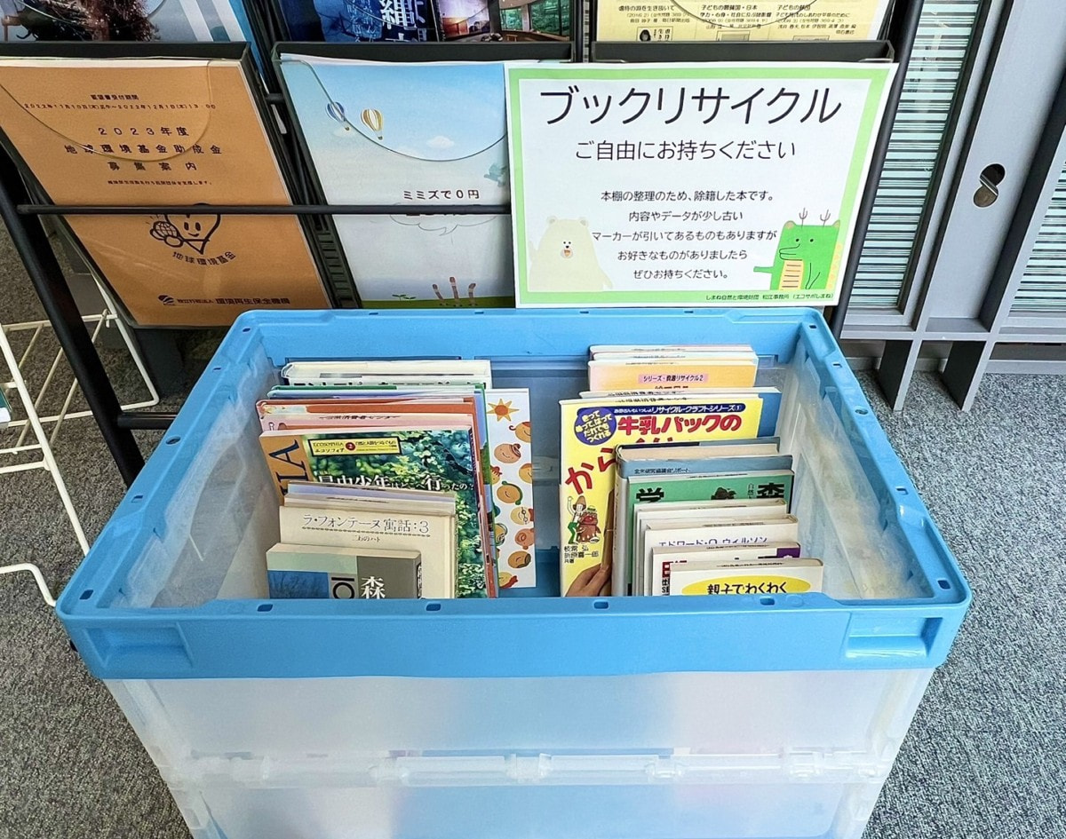 ブックリサイクルの箱は、エコサポしまね事務所の扉前ラックの下にあります。(松江市殿町8−3タウンプラザしまね2階)