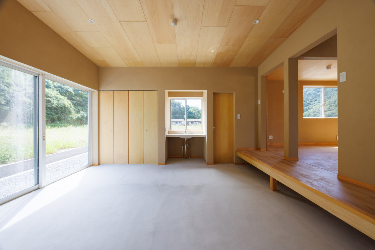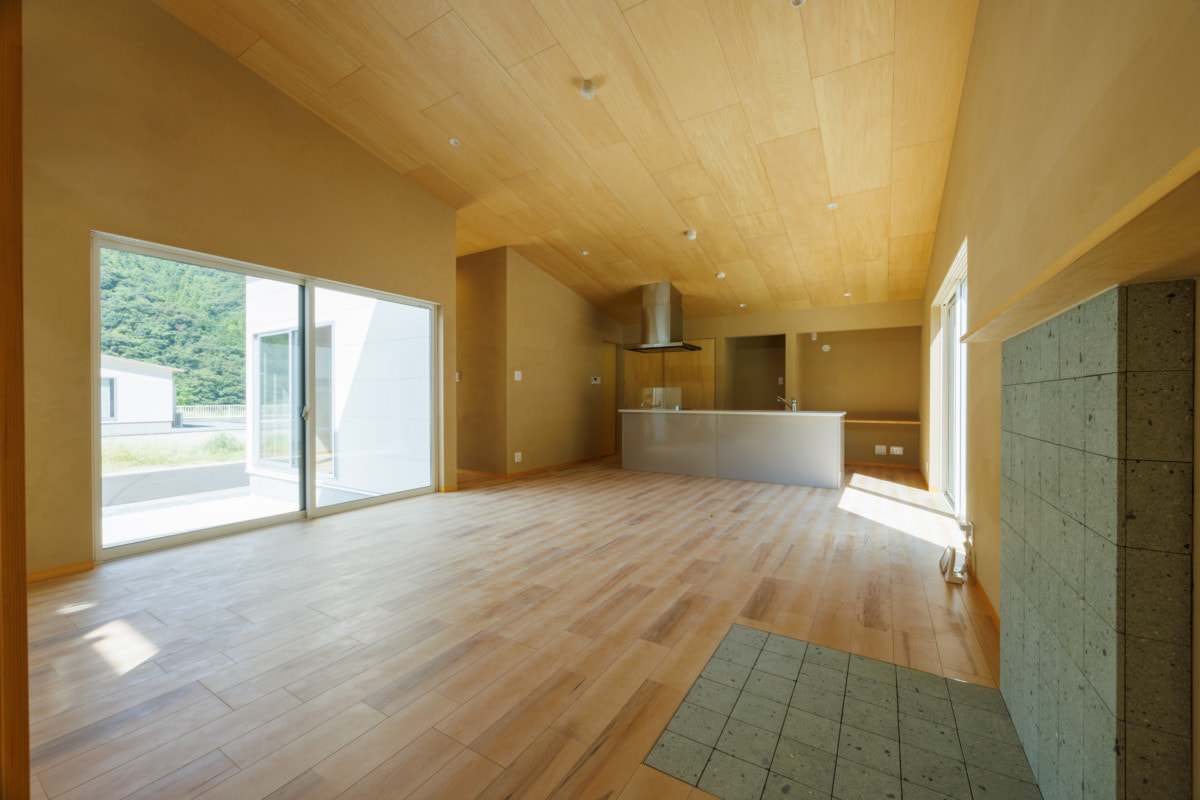 リビングの一角をよく見ると、タイル貼りのスペースがあります。ここ、薪ストーブが置ける場所なんです。