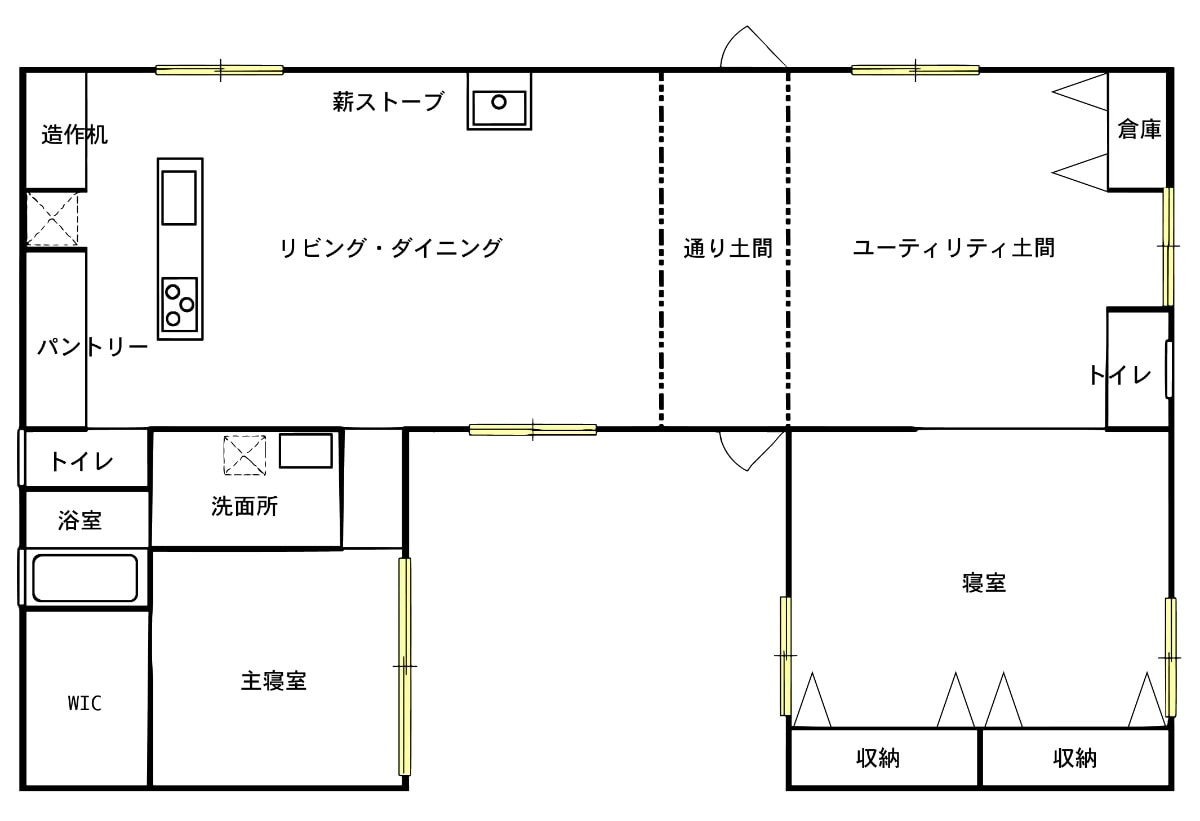 木造1階建ての3LDKに、ユーティリティ土間を加えた間取りとなっています。