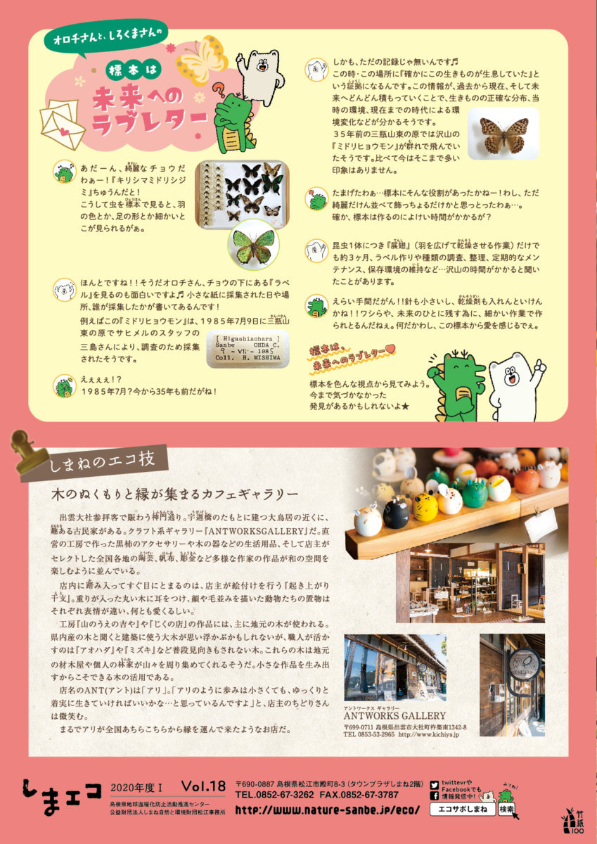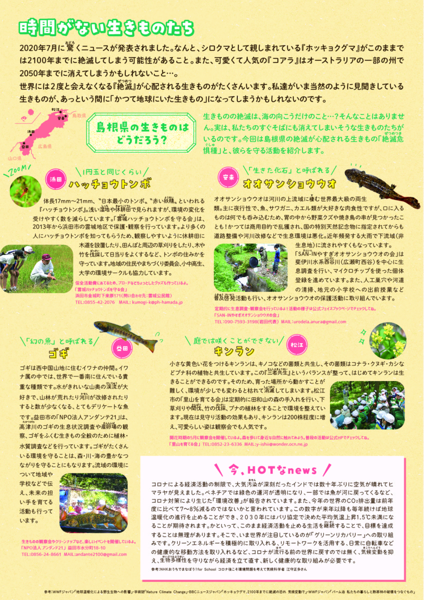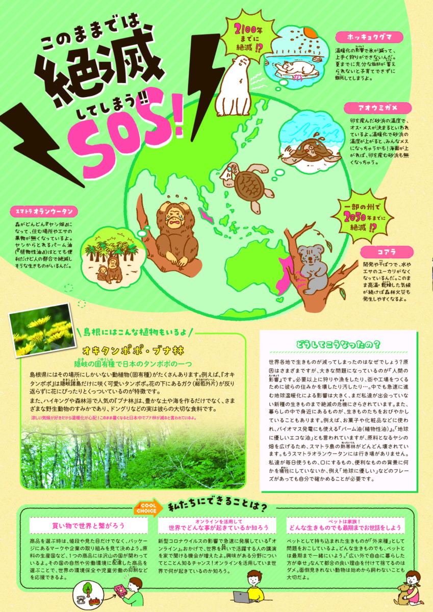 このままでは絶滅してしまう!!SOS / 島根のいきものはどうだろう? / 私たちにできることは? / 今、HOTなnews / オロチさんとしろくまさんの「標本は未来へのラブレター」/